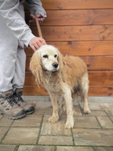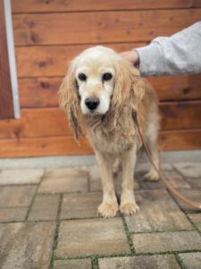 Cappuccino ist ein etwa 15‑jähriger Cocker-Mix-Rüde (ca. 11 kg), der sein bisheriges Leben auf der Straße und offenbar an der Kette verbringen musste. Er kannte keine Zuwendung, erwartete von Menschen nur Schlechtes und reagierte aus Angst mit Beißen.