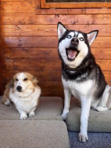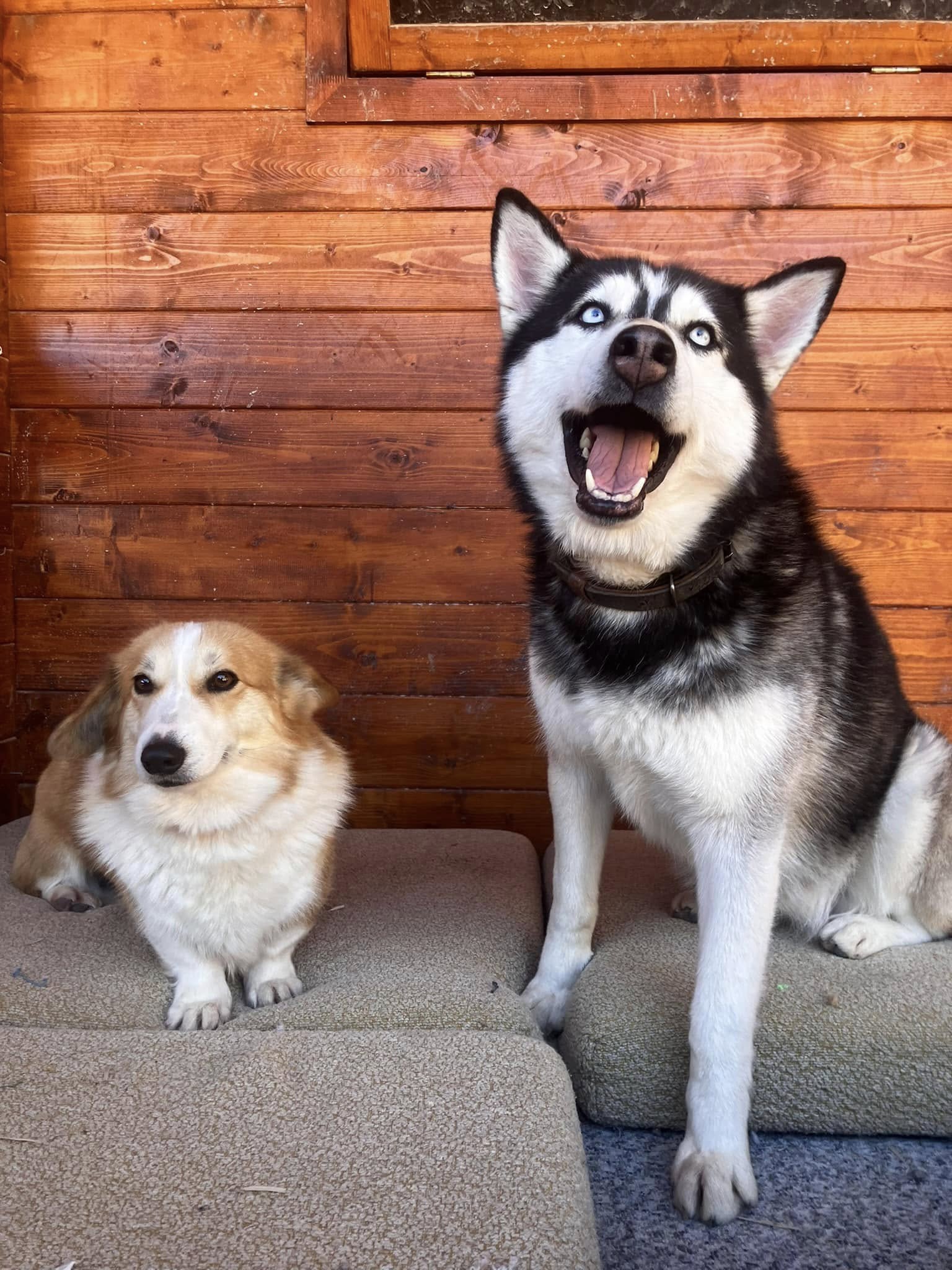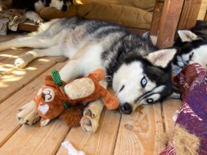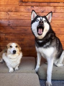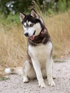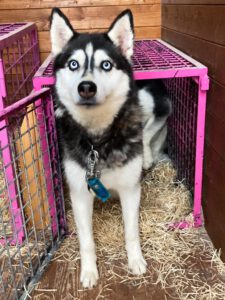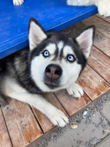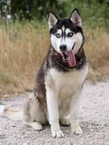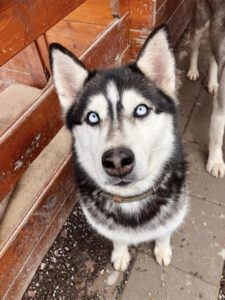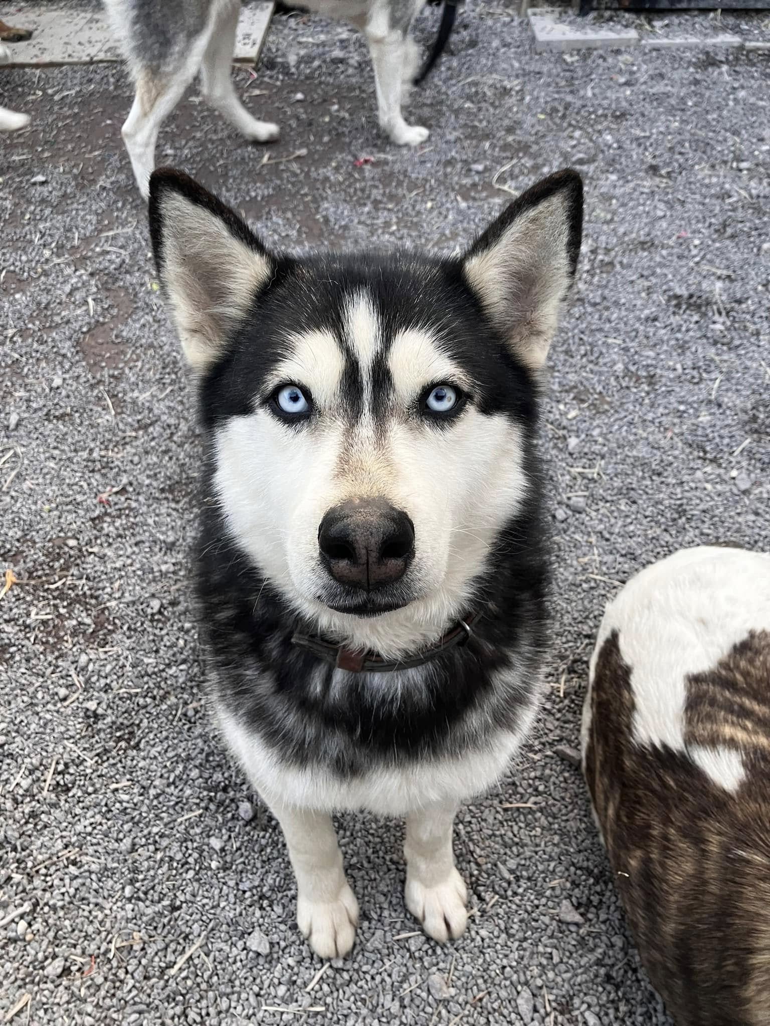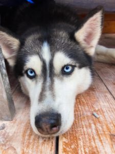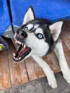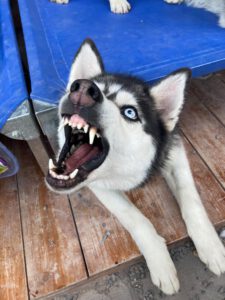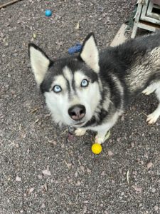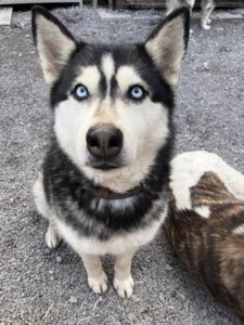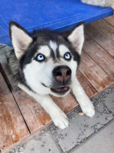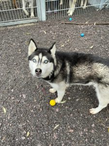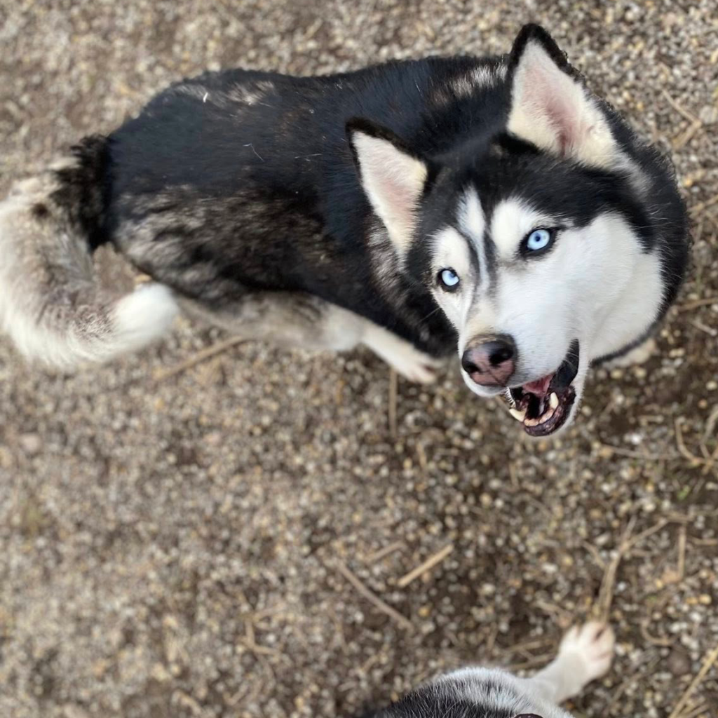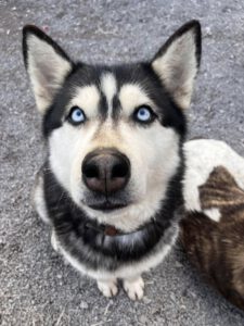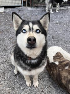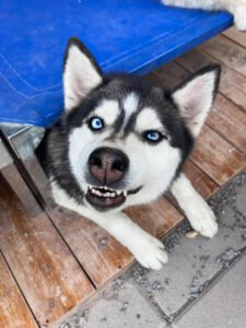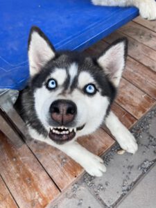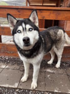 Sie ist eine sehr witzige Husky-Dame mit lustigen Zoomies, gleichzeitig kan sie aber auch sehr faul und entspannt sein. Sie hat einige Angewohnheiten, die ungewöhnlich wirken, für sie aber völlig normal sind. Beim Tierarzt und in ähnlichen Situationen benötigt sie zwingend einen Maulkorb.